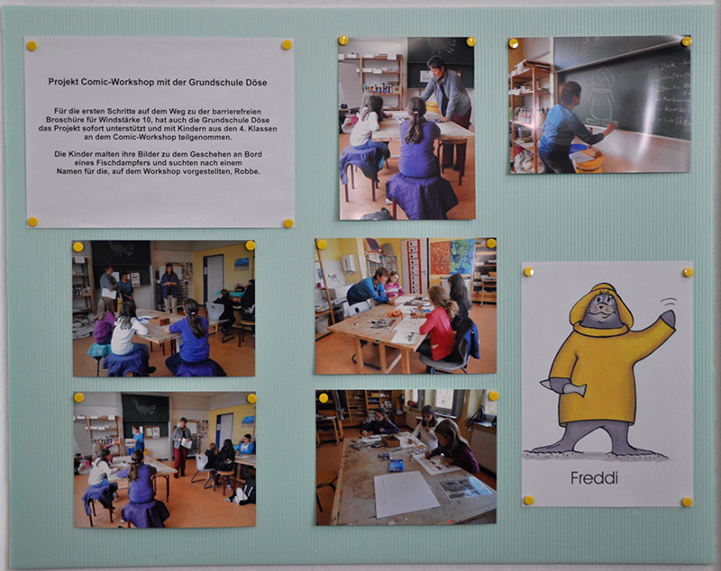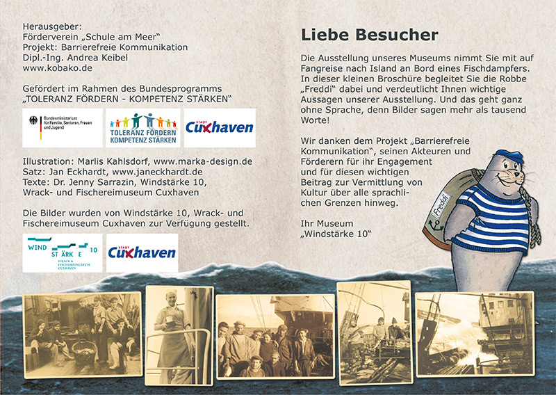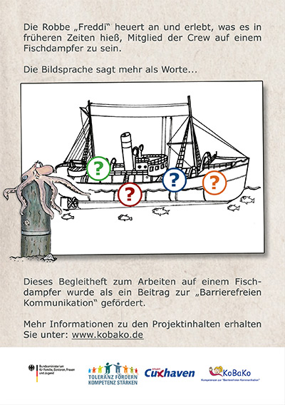 Gemeinsam mit dem Museum Windstärke 10 und der Illustratorin Marlis Kahlsdorf wird im Rahmen des Projektes eine kleine Comicbroschüre entwickelt, die in barrierefreier Bildsprache das Leben und Arbeiten auf einem Fischdampfer beschrieben wird.