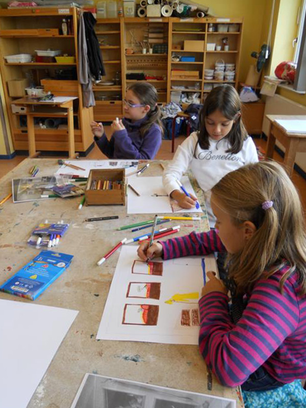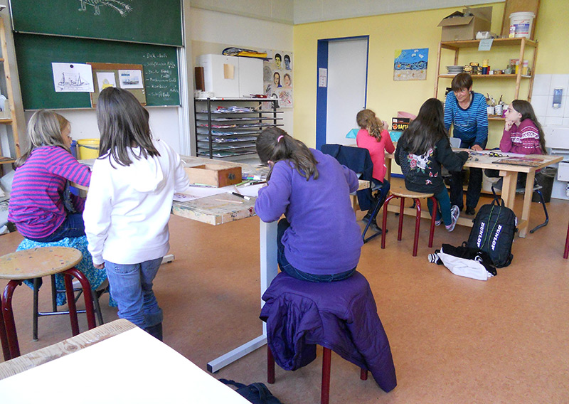 Die Illustratorin Marlis Kahldorf und Schülerinnen malen zusammen Bildergeschichten