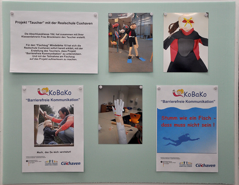 Eine 10. Klasse der Realschule Cuxhaven hatte die Aufgabe übernommen, hierzu einen Taucher, im Zusammenhang mit der Gebärdensprache der Taucher unter Wasser, anzufertigen und ihn als Träger für die Botschaft einzusetzen.