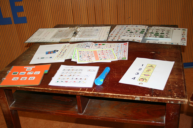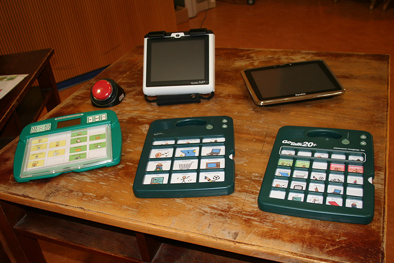 Zur weiteren Unterstützung, je nach Bedarf, gibt es eine Auswahl von sogenannten Talkern, handlichen Kleincomputern, die mit diesen Bildsymbolen bestückt werden können.